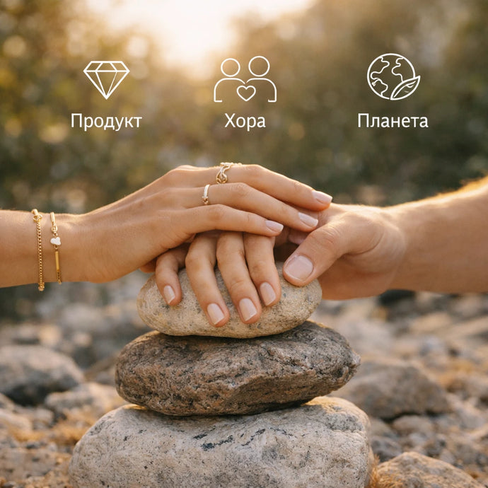Вярваме, че страхотните бижута трябва да „се усещат добре“ във всеки смисъл на думата. Затова нашата рамка за устойчивост е изградена върху три стълба - Продукт, Хора и Планета - които насочват всяко наше решение: от материалите, които избираме, до партньорите, с които работим.