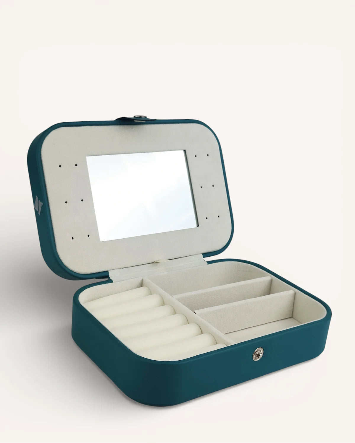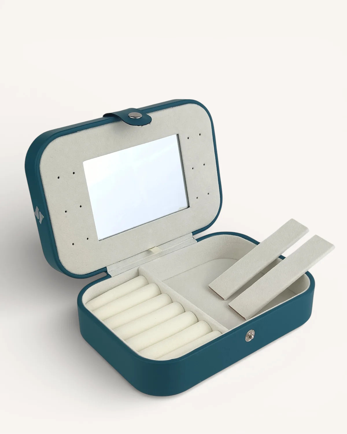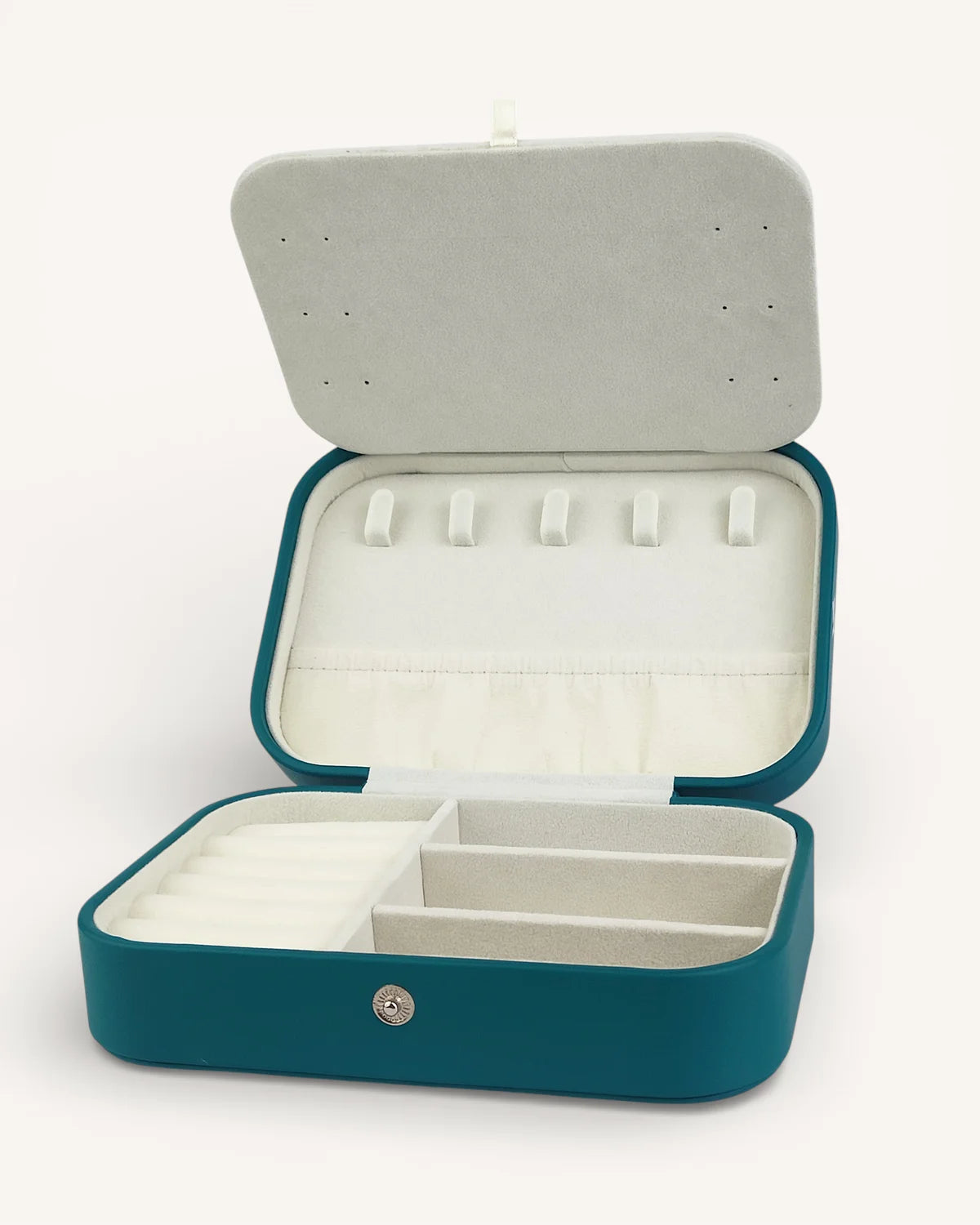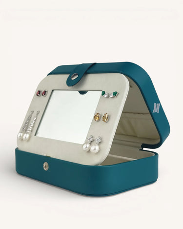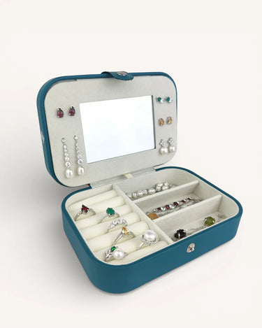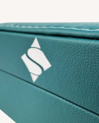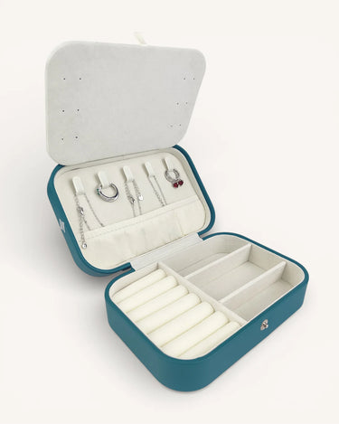 Компактен, елегантен и изключително практичен. Органайзерът е изработен от еко кожа, прецизно зашит по ръбовете и завършен с капса за сигурно закопчаване. Свежото тюркоазено отвън контрастира с нежна бежова вътрешност, която подчертава всяко бижу.