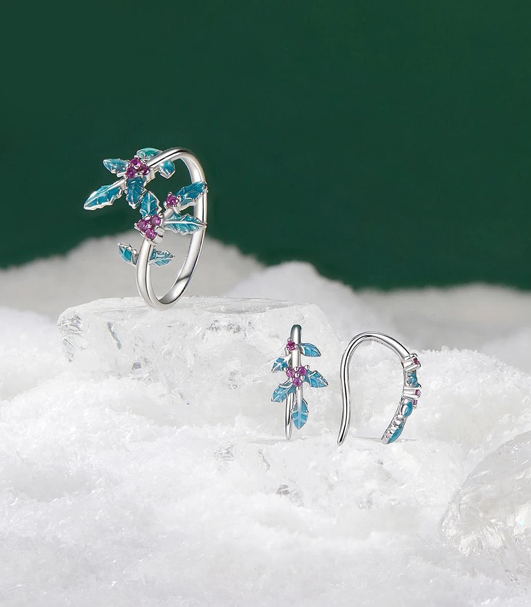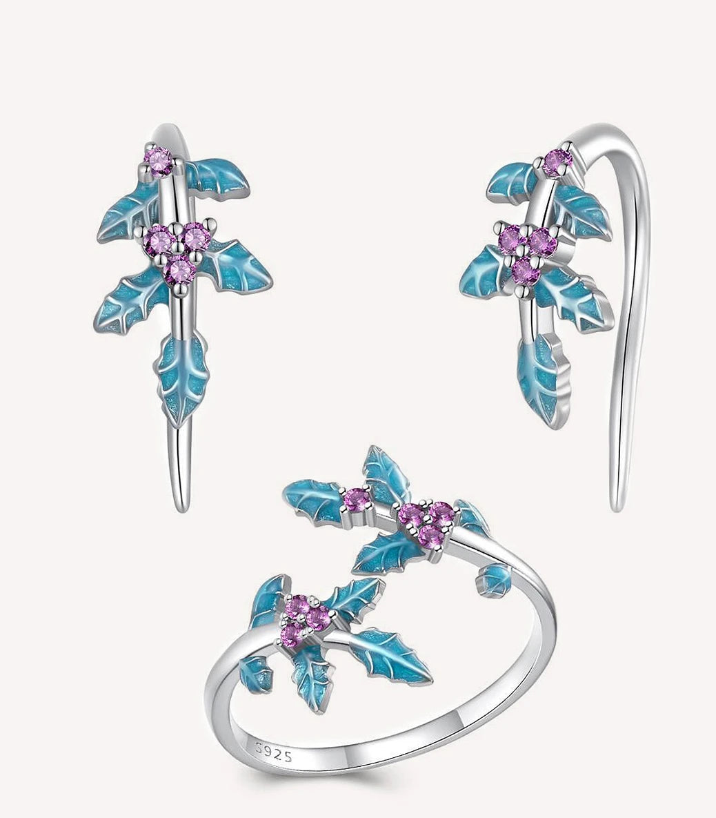 Сребърни обеци и сребърен регулируем пръстен с виолетов кубичен циркон и тюркоазен емайл