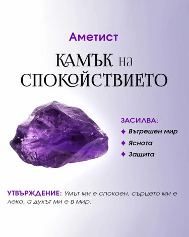 Бижу с аметист е малък ритуал за баланс: „Вдишвам тишина, издишвам напрежение, умът ми се прояснява и решенията ми са мъдри и уверени.“ Перфектен е за дни с много екрани, срещи и срокове, както и за вечер, когато искаш да се приземиш и да се върнеш към себе си. Подарък за човек, който заслужава мир.
