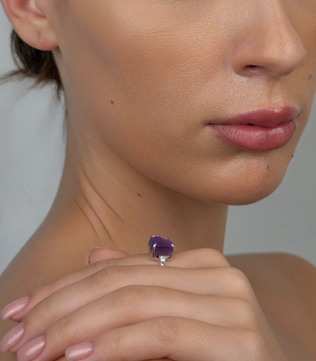 Този пръстен, с необработен камък, е за ценителите на суровата, истинска красота - такава, каквато природата я е създала. Всеки камък е със собствена форма, оттенък и „несъвършенства“, които го правят уникален и единствен по рода си. Двата бели циркона добавят фин блясък, който подчертава и усилва естественото му излъчване.