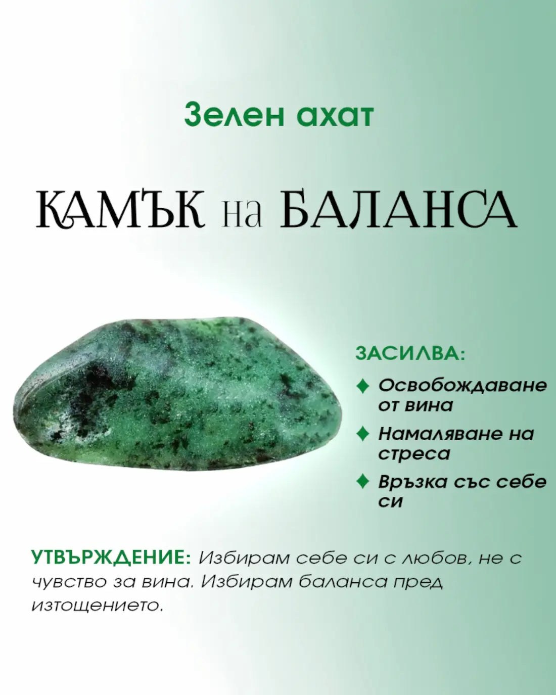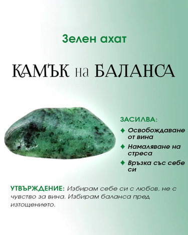 Зеленият ахат е камъкът на баланса - твоето емоционално „рестартиране“, когато животът те дърпа в твърде много посоки. В кристалната традиция се олицетворява с връзката със себе си, освобождаване на вина и успокояване на вътрешната буря. Той те връща към теб самия, помага ти да се свериш със своята истина, а не с чуждите очаквания и напомня, че почивката не е слабост, тя е грижа.