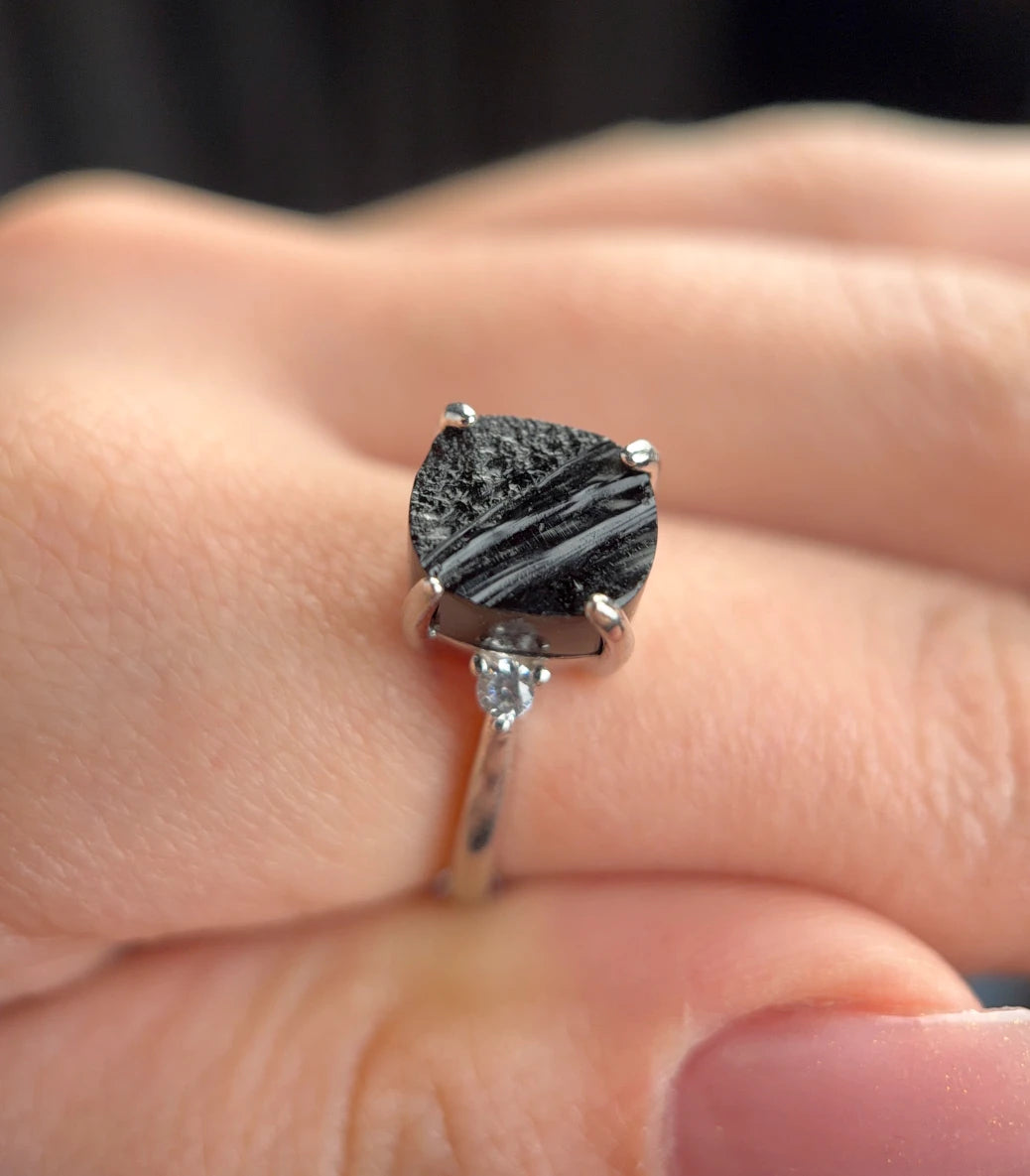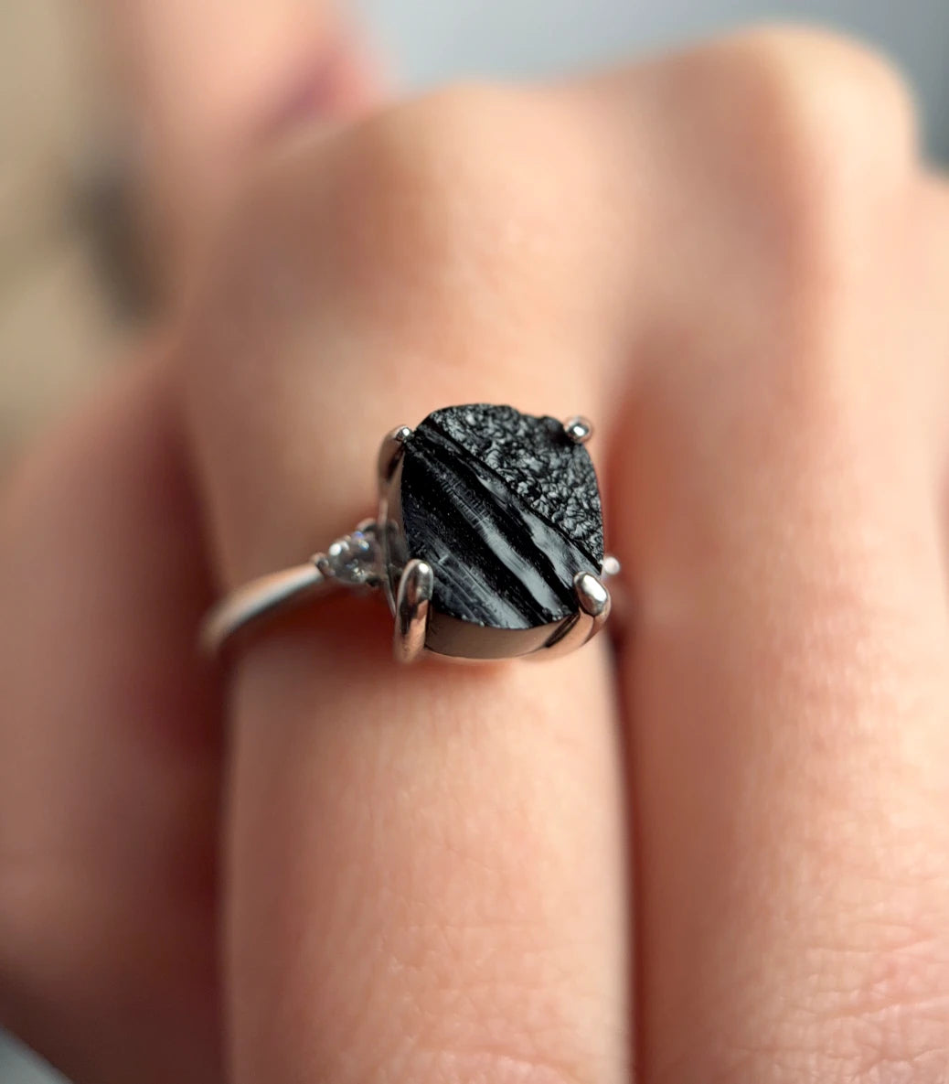 Този пръстен, с необработен камък, е за ценителите на суровата, истинска красота - такава, каквато природата я е създала. Всеки камък е със собствена форма, оттенък и „несъвършенства“, които го правят уникален и единствен по рода си. Двата бели циркона добавят фин блясък, който подчертава и усилва естественото му излъчване.