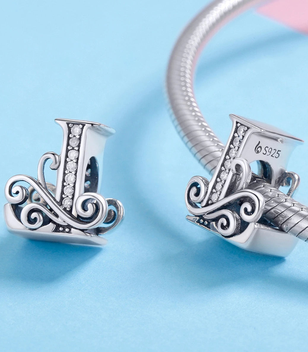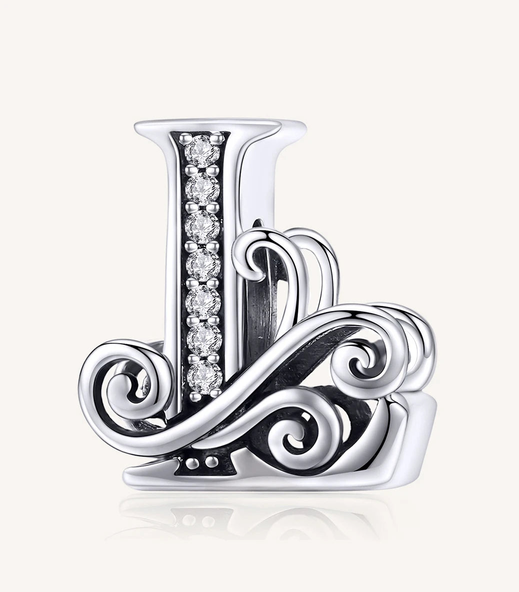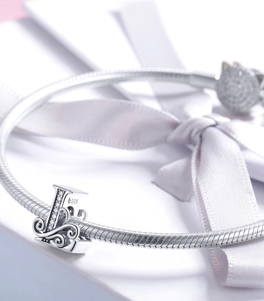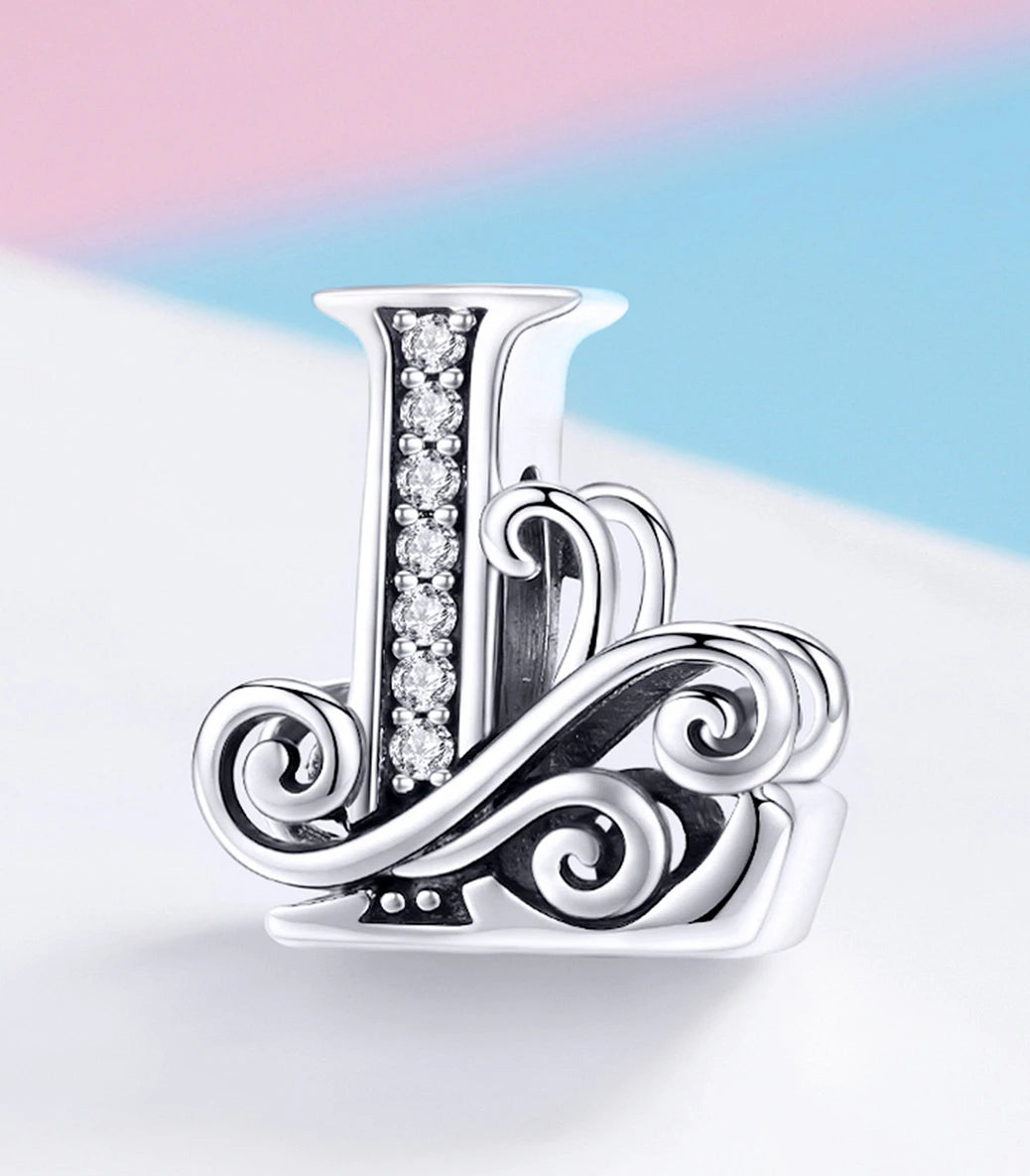 Сребърен талисман – латинска буква „L“ ( българска буква „Л“ ) - с бял кубичен циркон