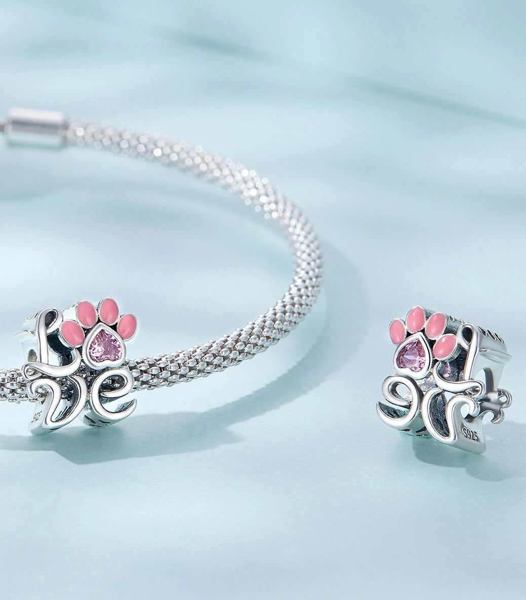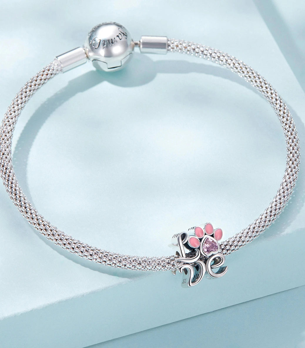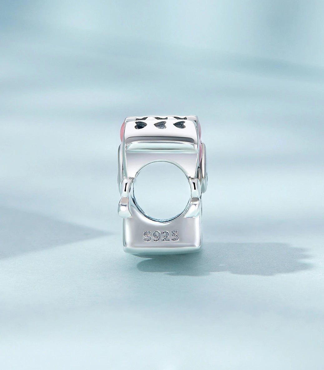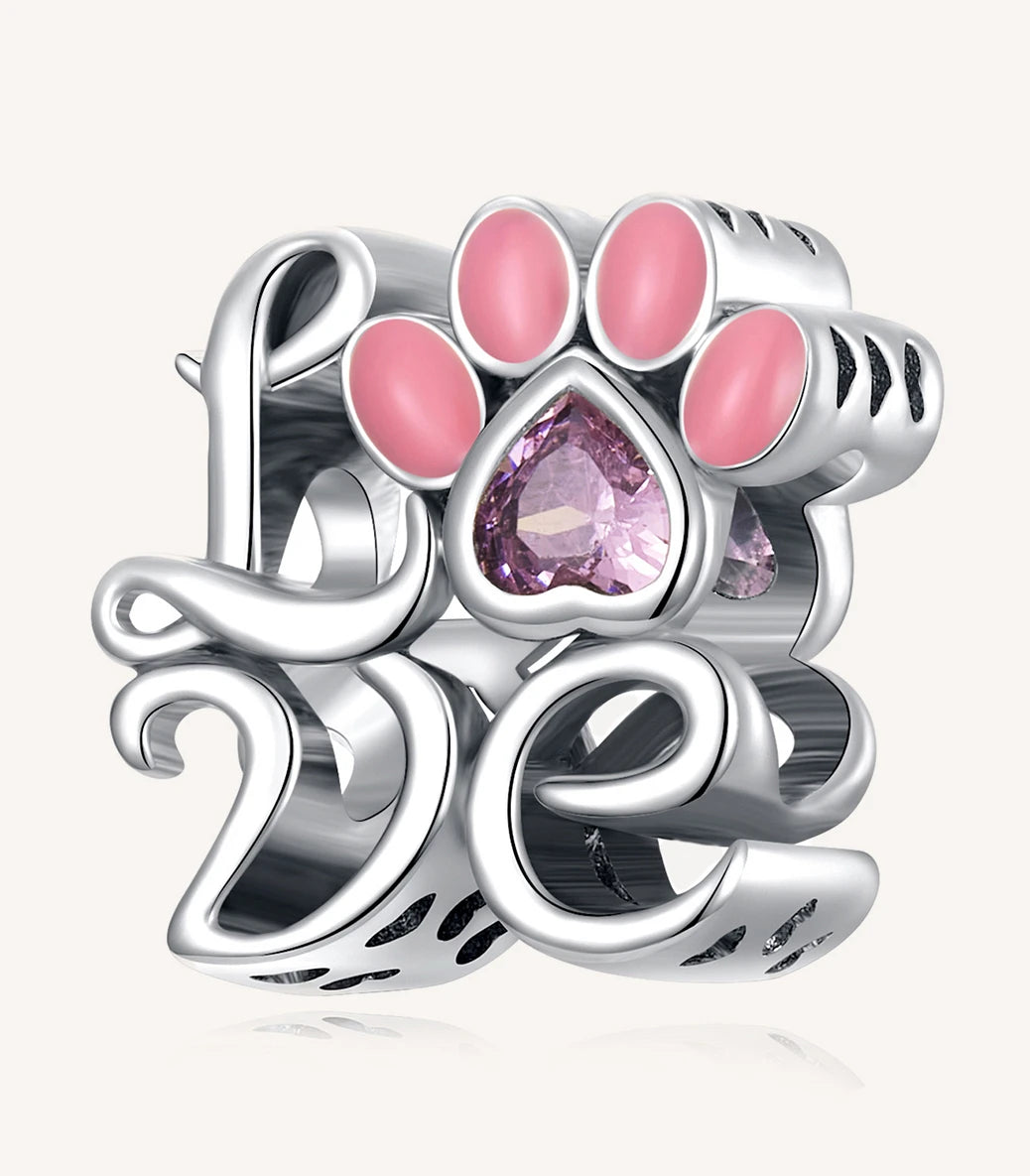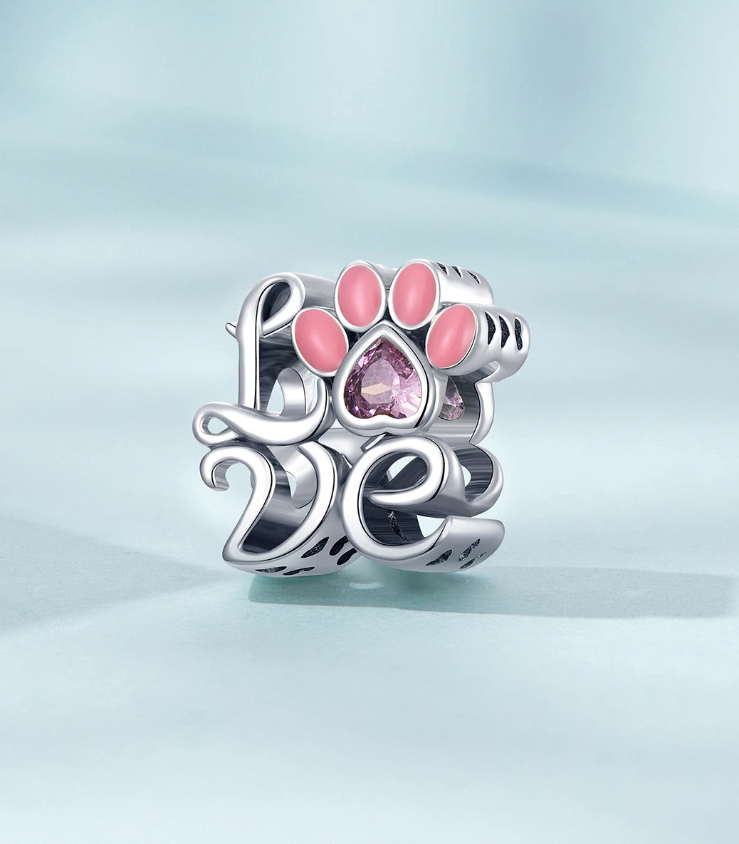 Сребърен талисман с лилав кубичен циркон, розов емайл и надпис “Love” (Любов)