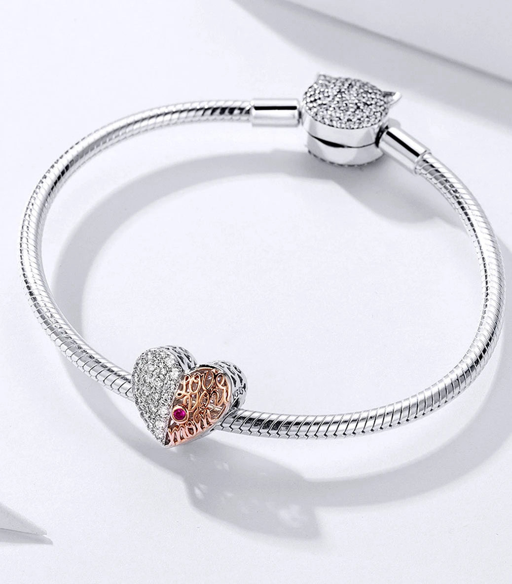 Сребърен талисман с надпис в цвят Rose Gold, бял и пурпурен кубичен циркон