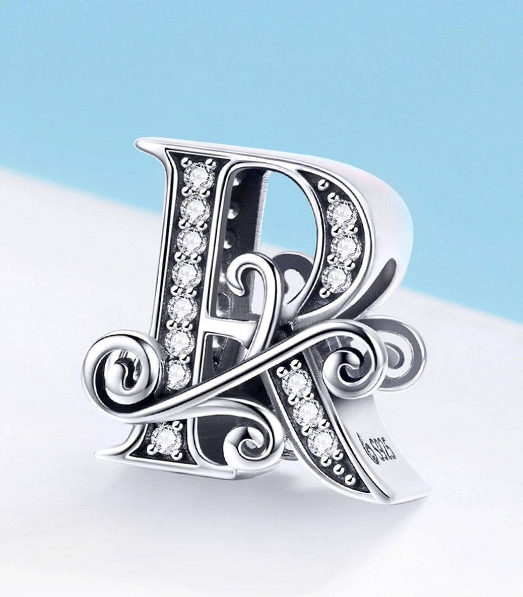 Сребърен талисман – латинска буква „R“ ( българска буква „Р“ ) - с бял кубичен циркон