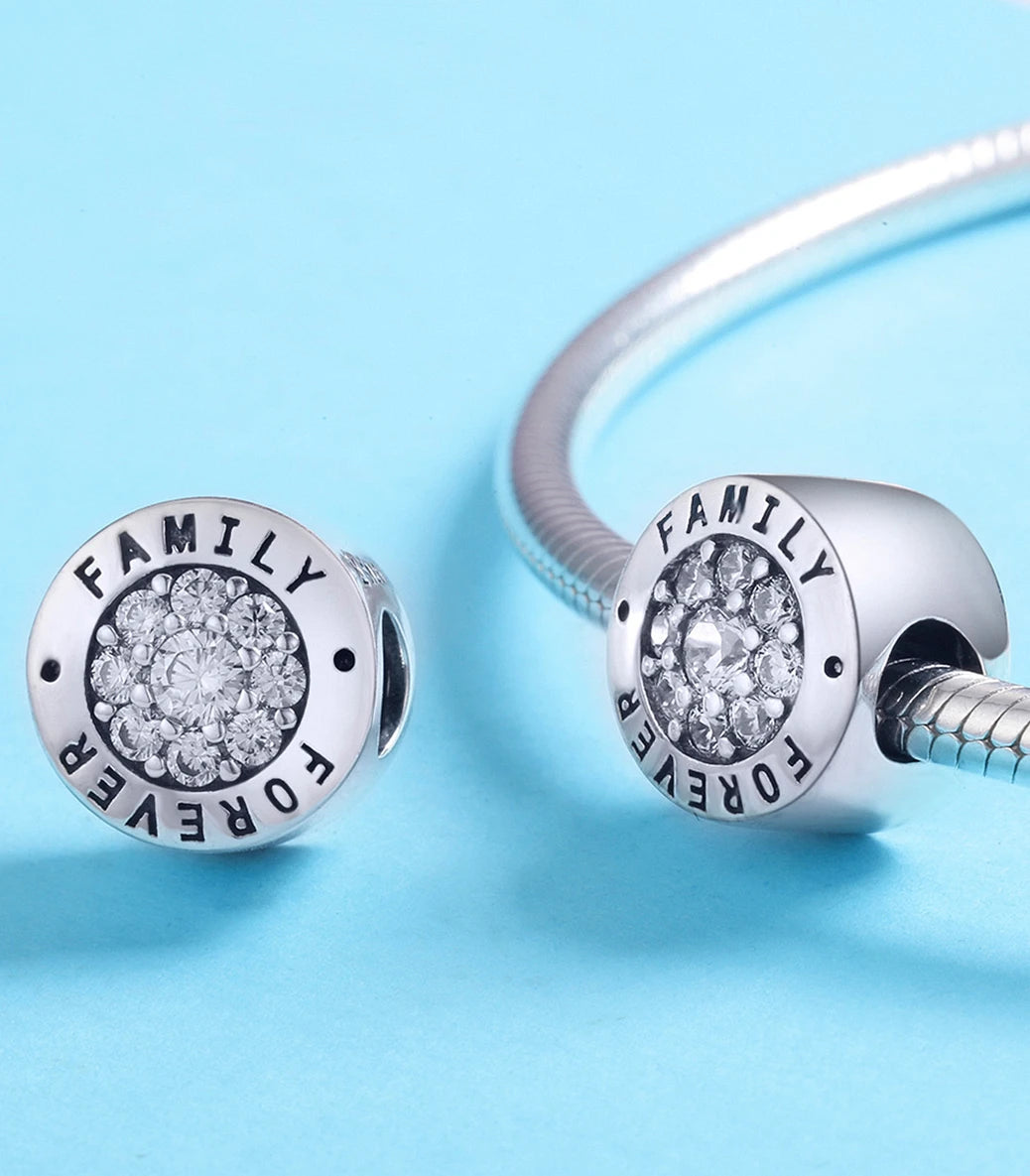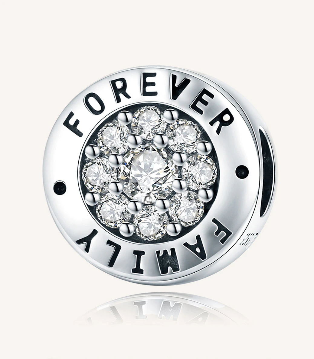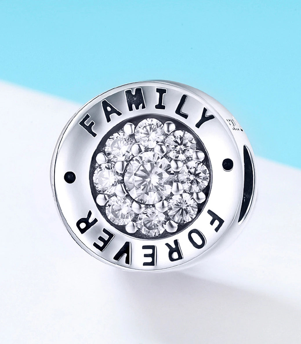 Сребърен талисман с бял кубичен циркон и надпис “Family forever” (Семейство завинаги)