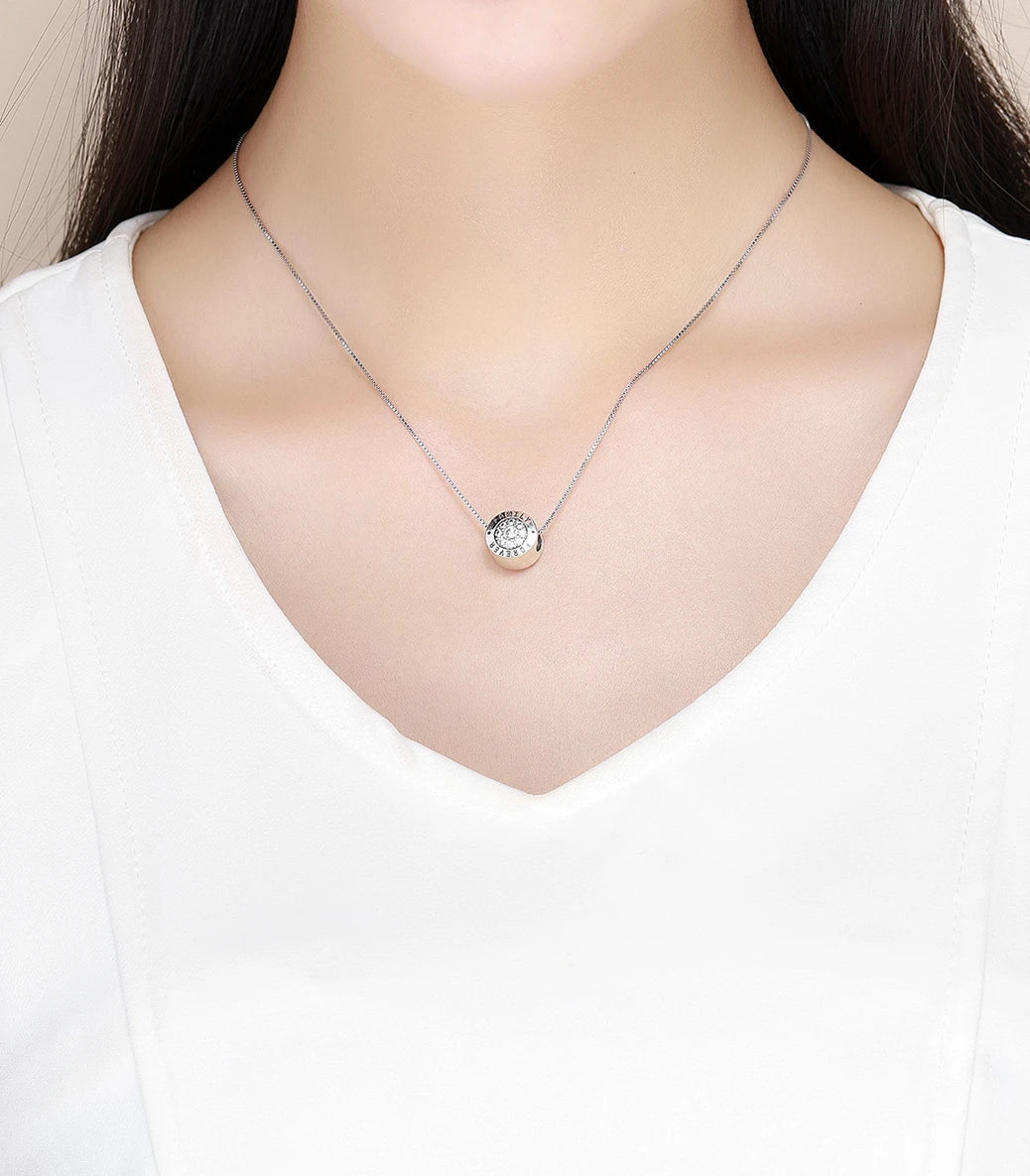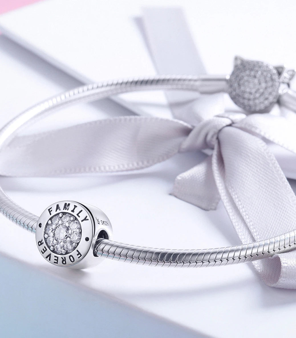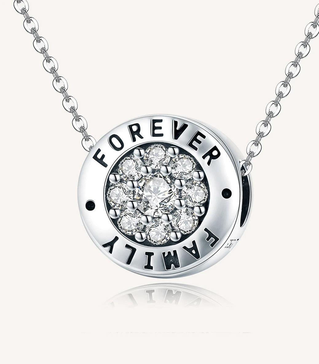 Сребърен талисман с бял кубичен циркон и надпис “Family forever” (Семейство завинаги)