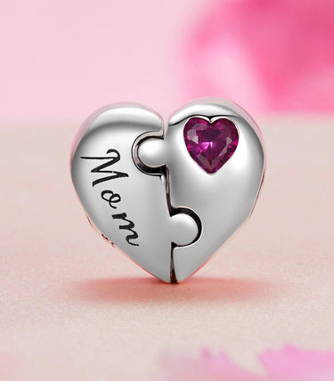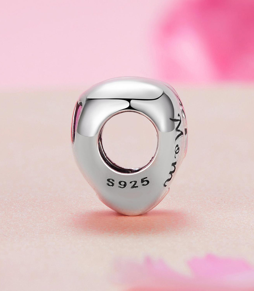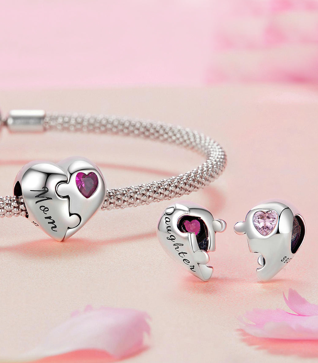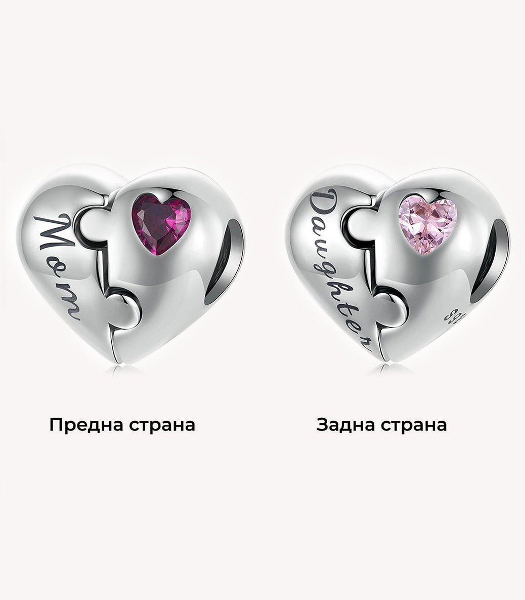 Сребърен талисман от две части, с розов и пурпурен кубичен циркон и надпис “Mom/Daughter” (Майка / Дъщеря)