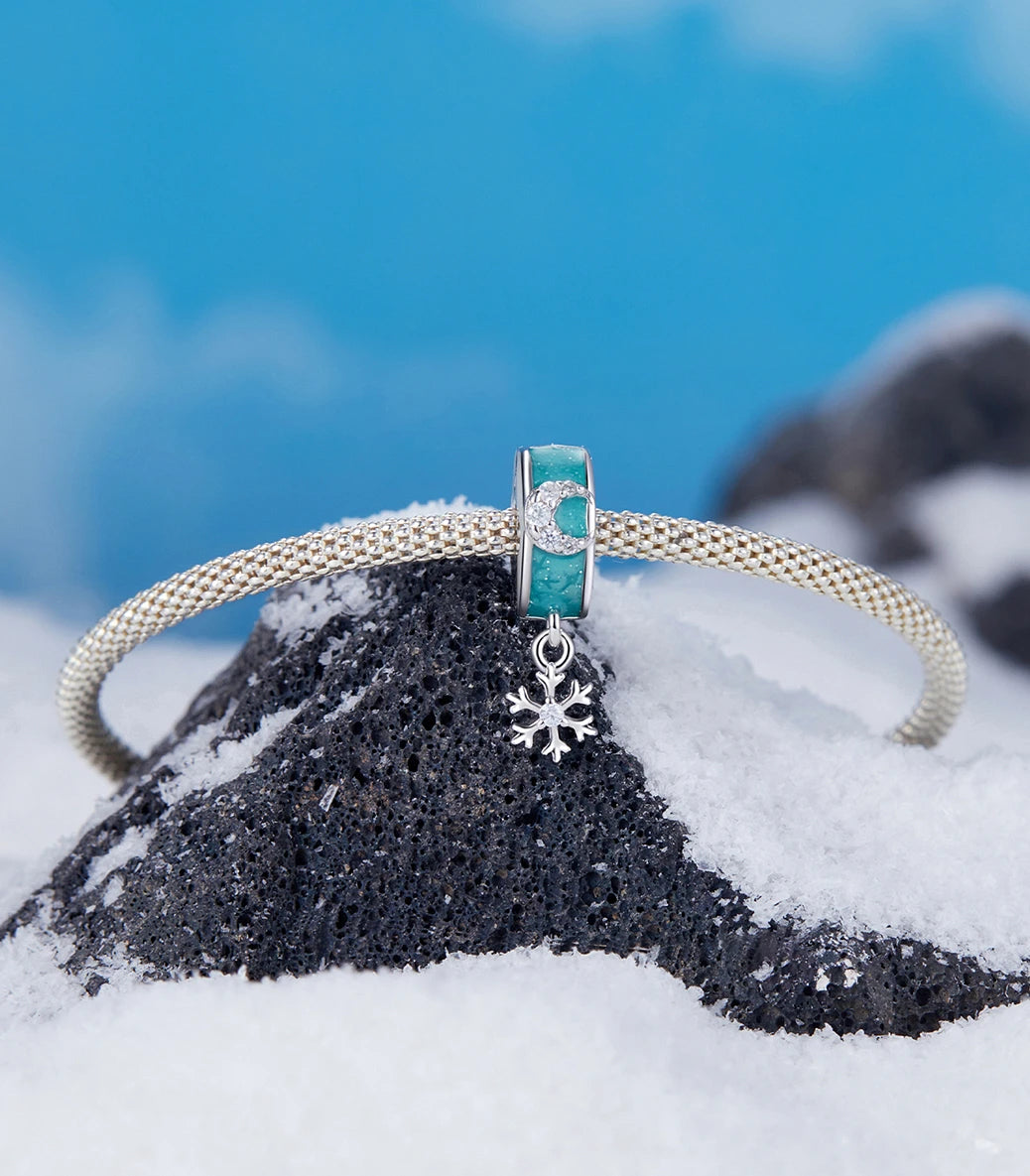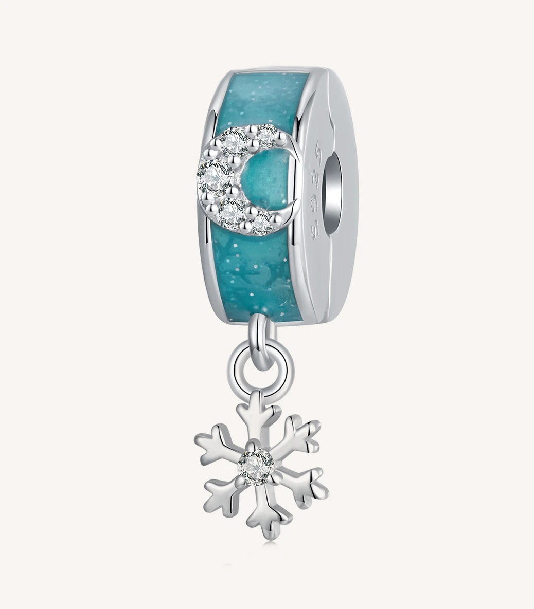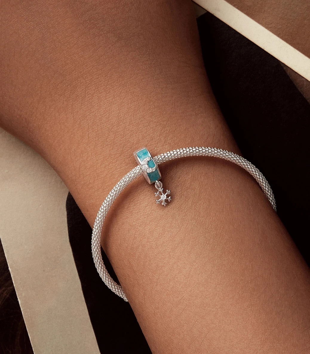 Сребърен талисман-клипс с вграден силиконов уплътнител, с бял кубичен циркон и тюркоазен емайл