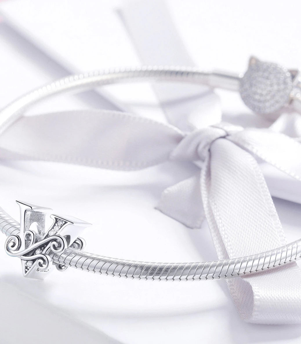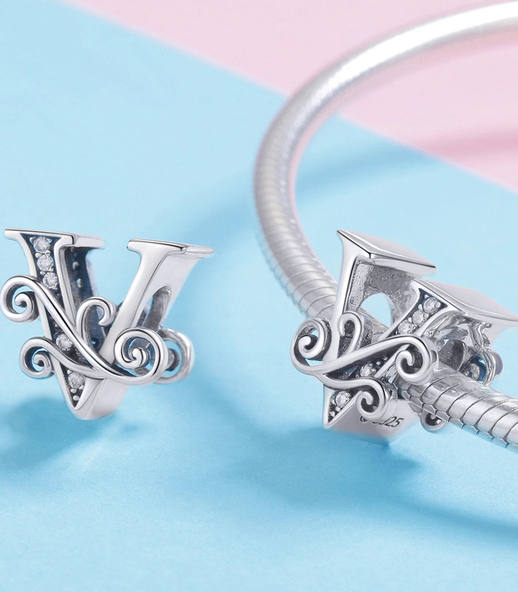 Сребърен талисман – латинска буква „V“ ( българска буква „В“ ) - с бял кубичен циркон