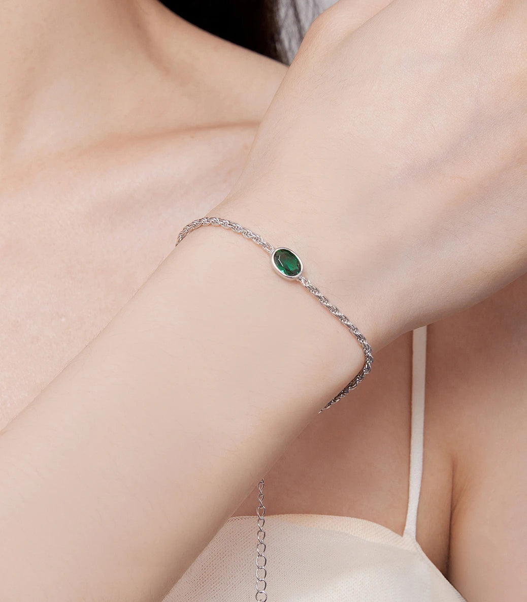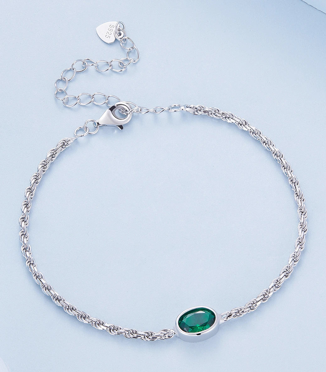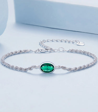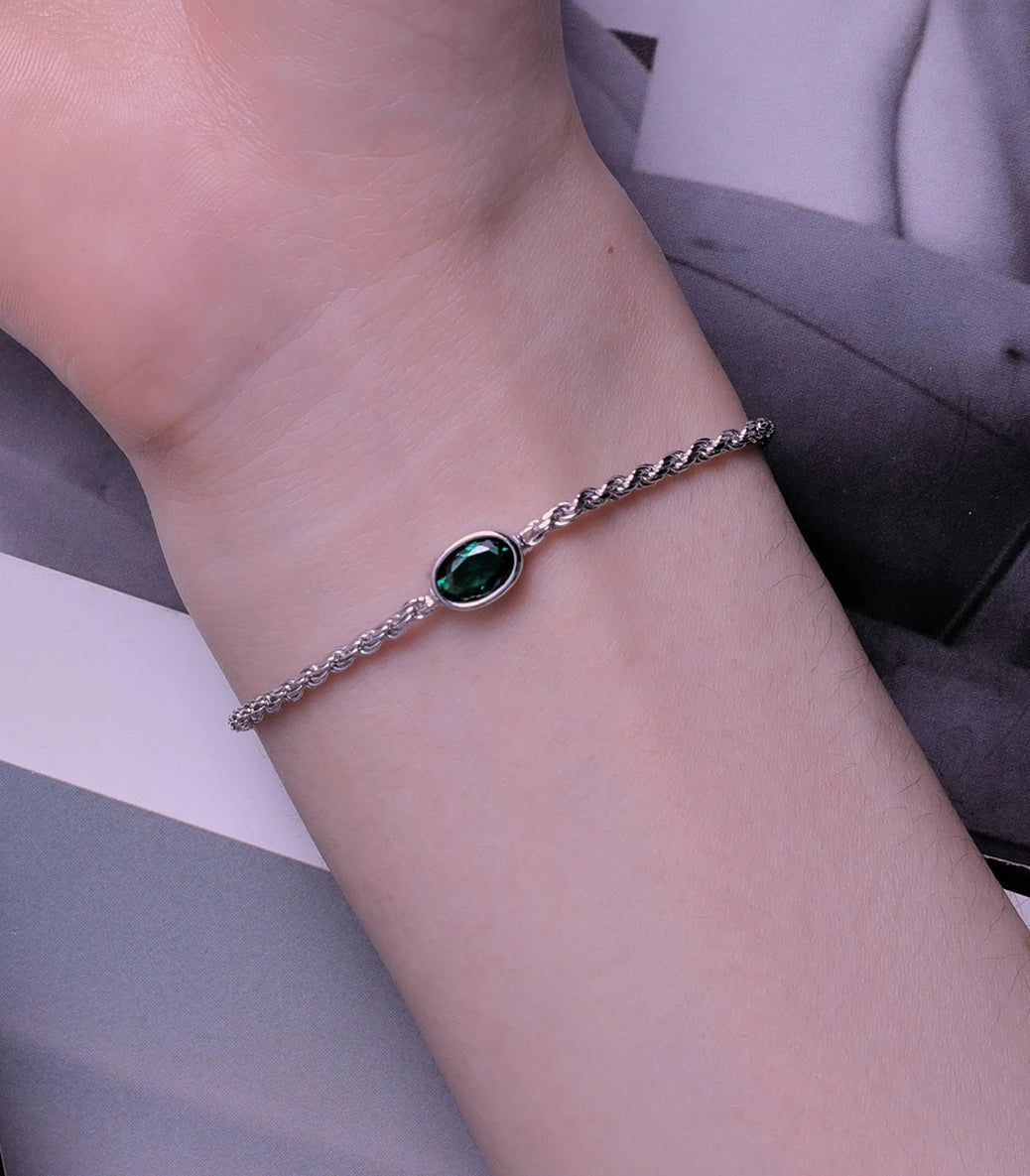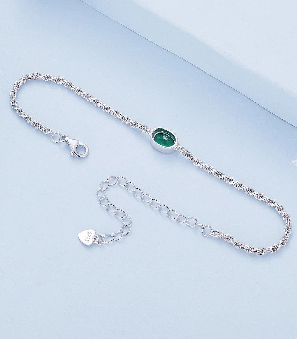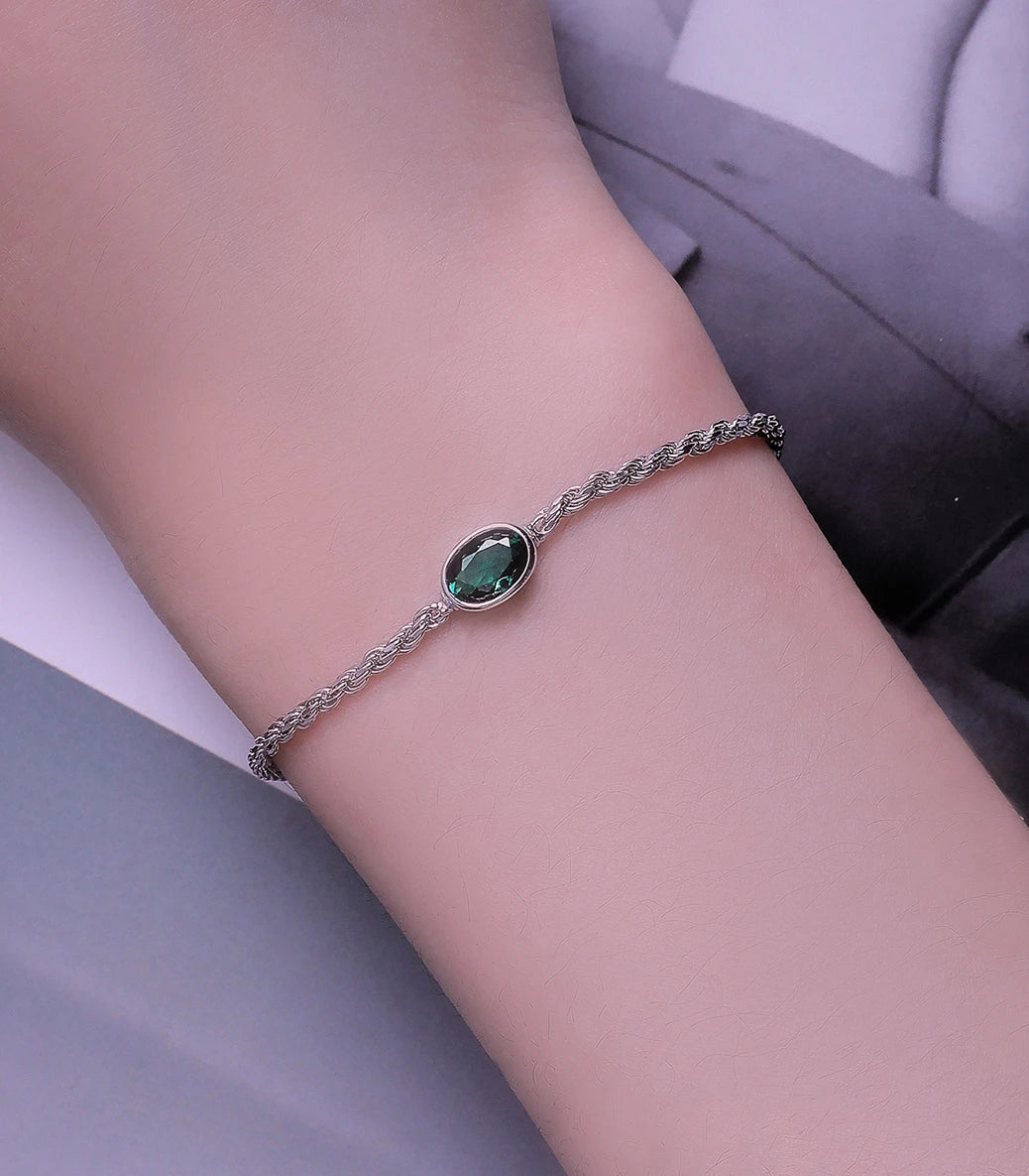 Сребърна регулируема гривна със закопчалка със запазващ механизъм и зелен кубичен циркон