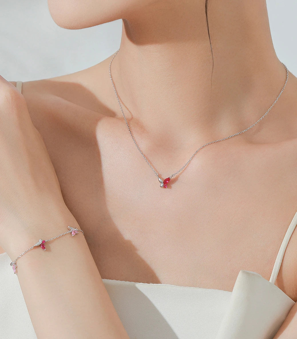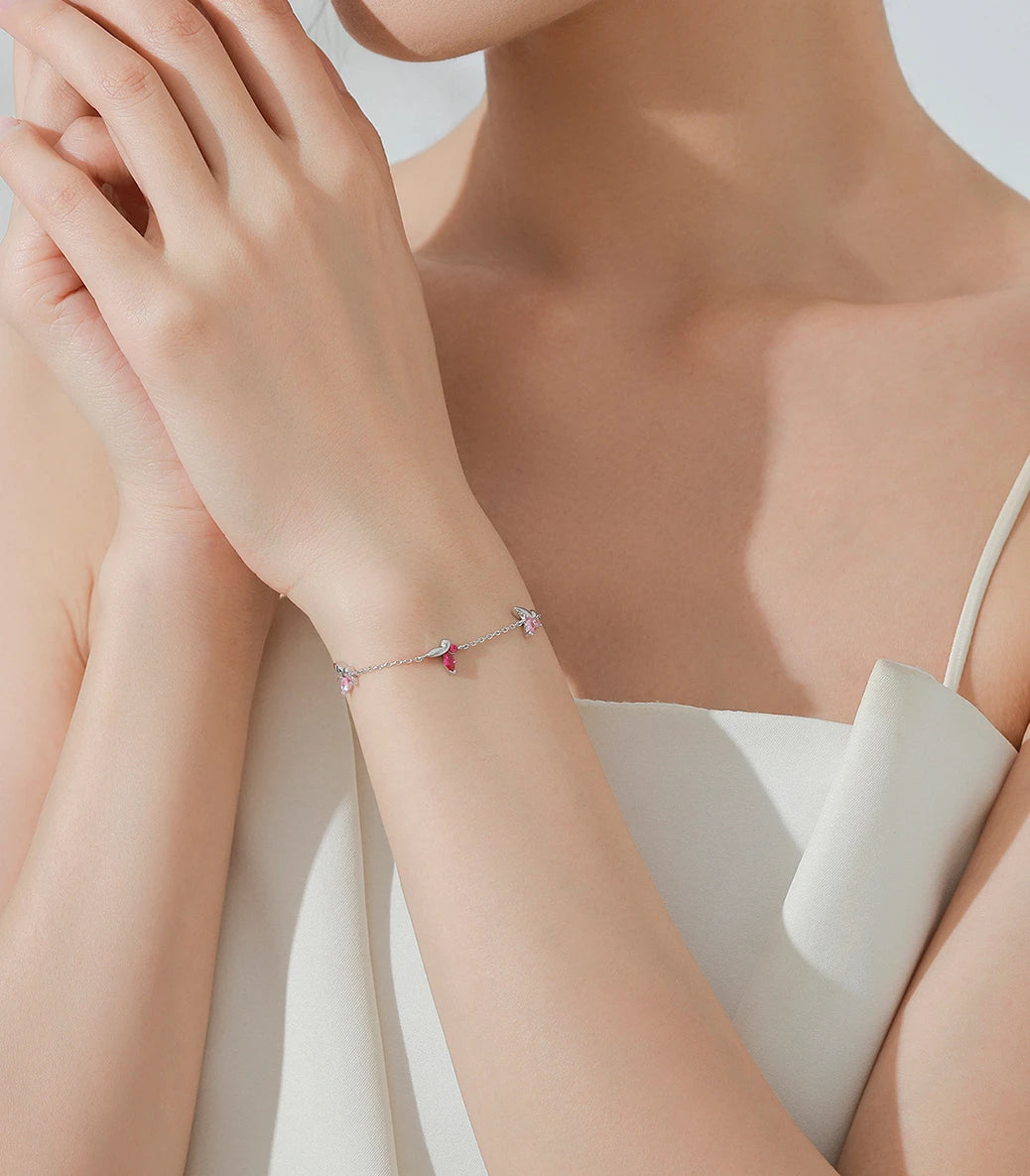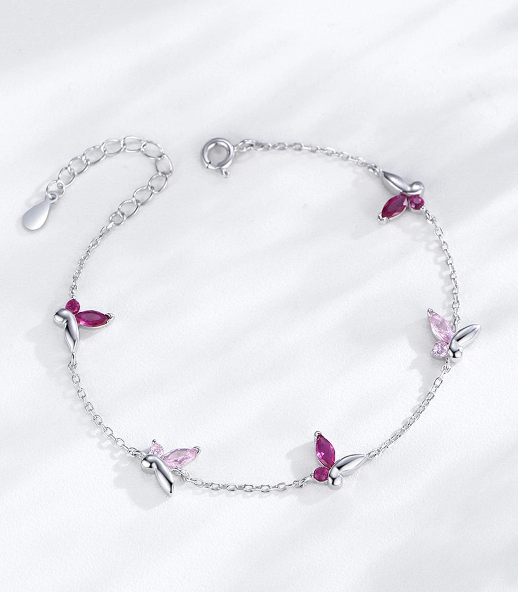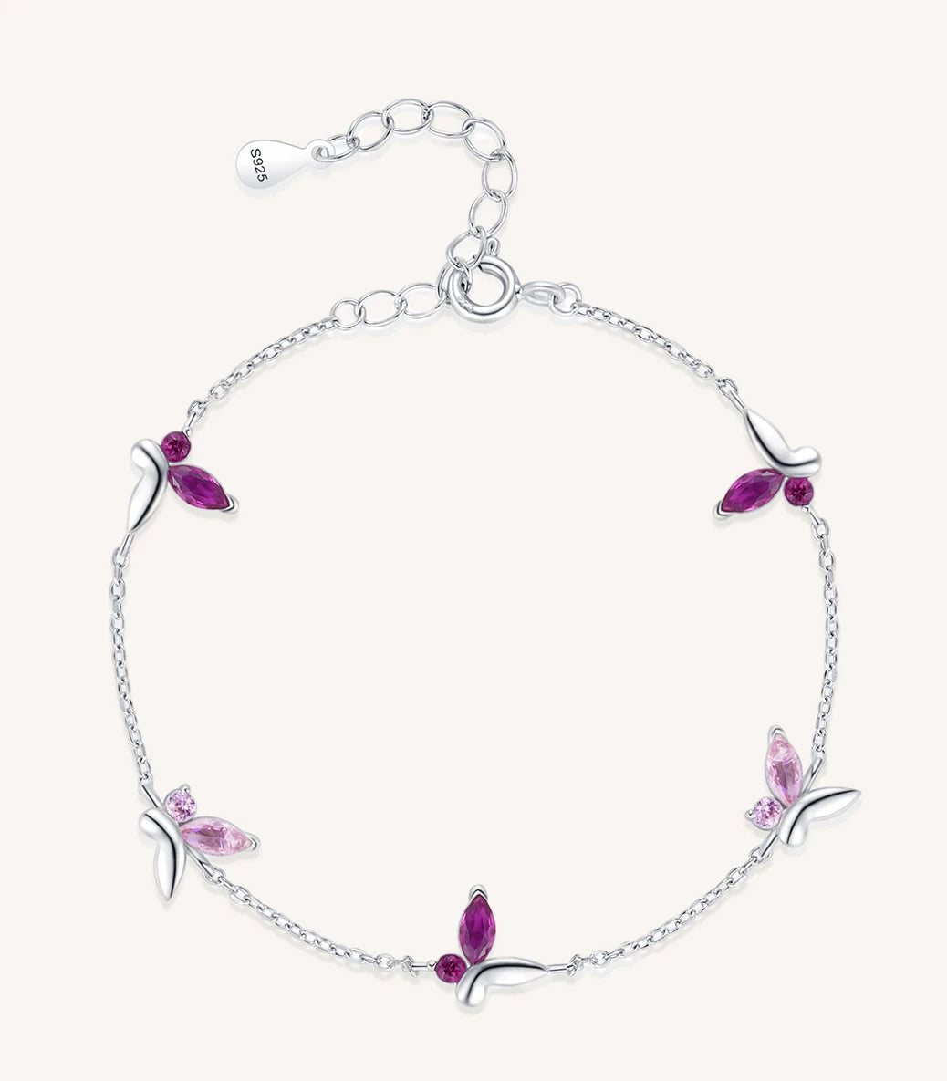 Сребърна регулируема гривна със закопчалка със захващащ механизъм и пурпурен и розов кубичен циркон