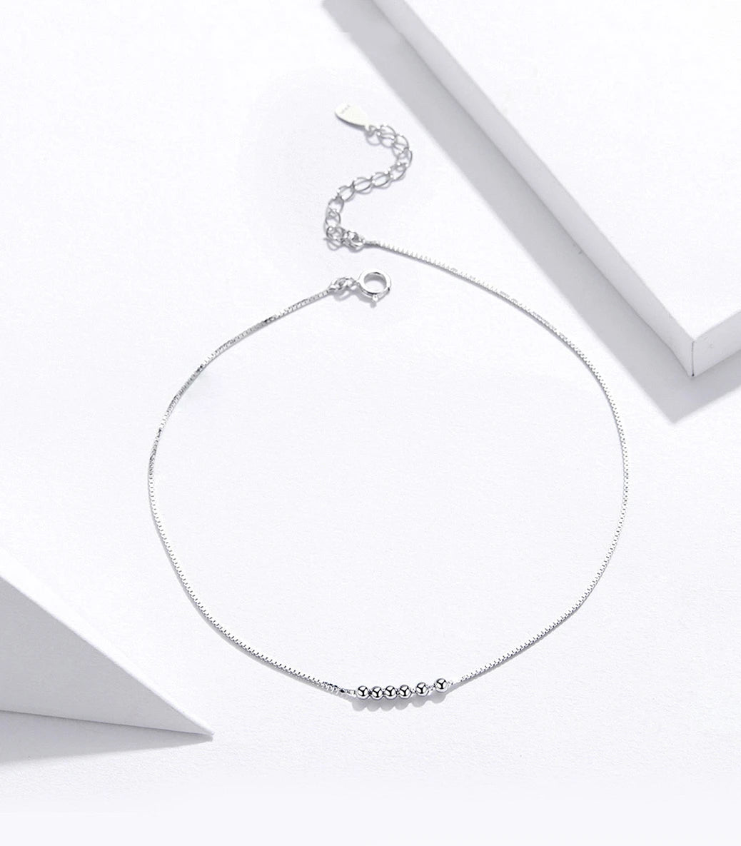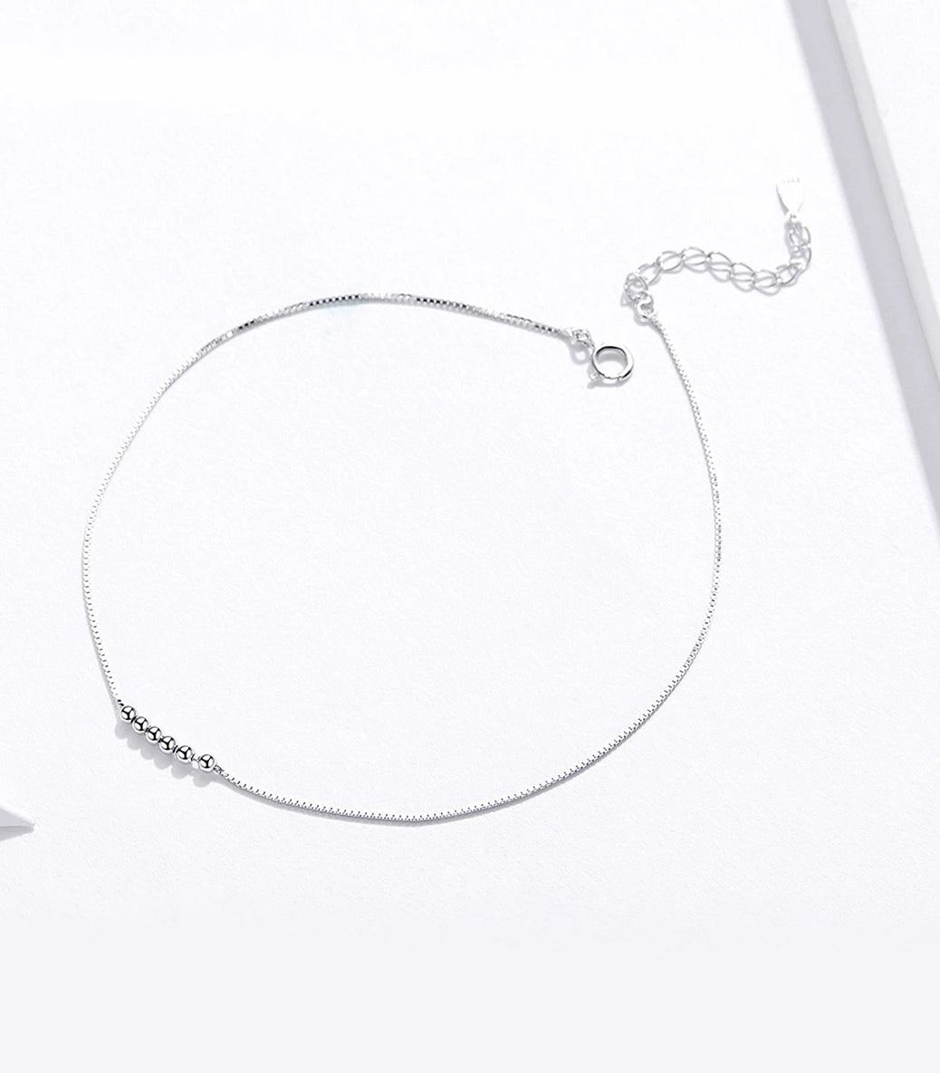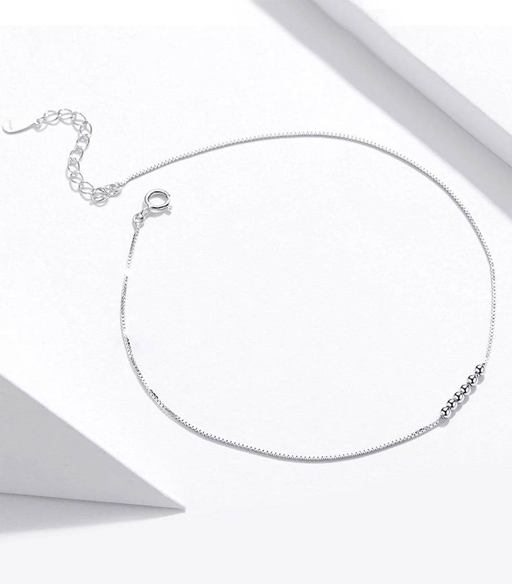 Сребърна регулируема гривна за крак със закопчалка със захващащ механизъм и сребърни подвижни мъниста