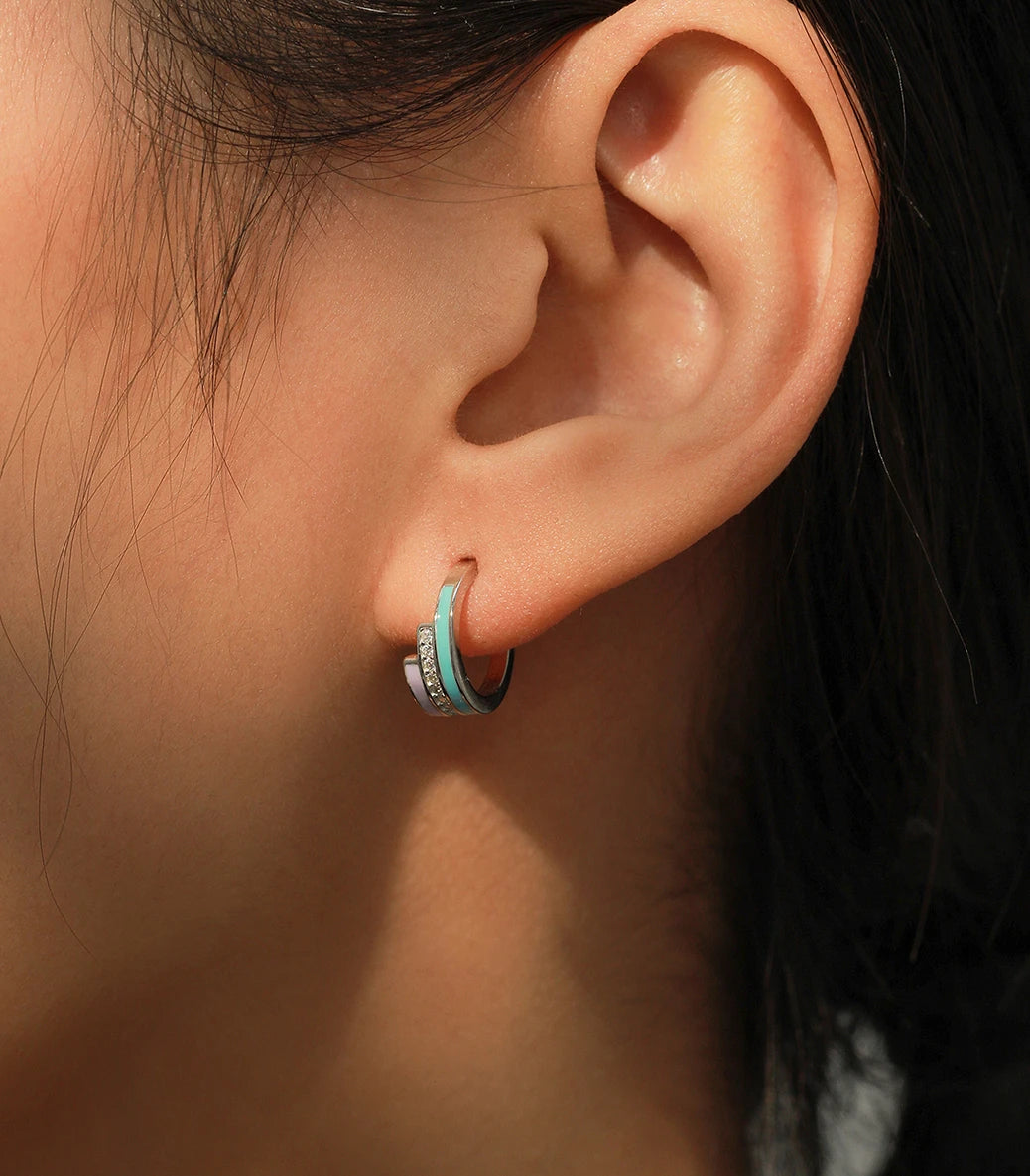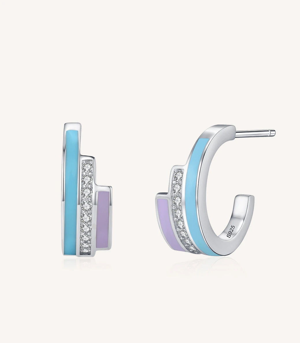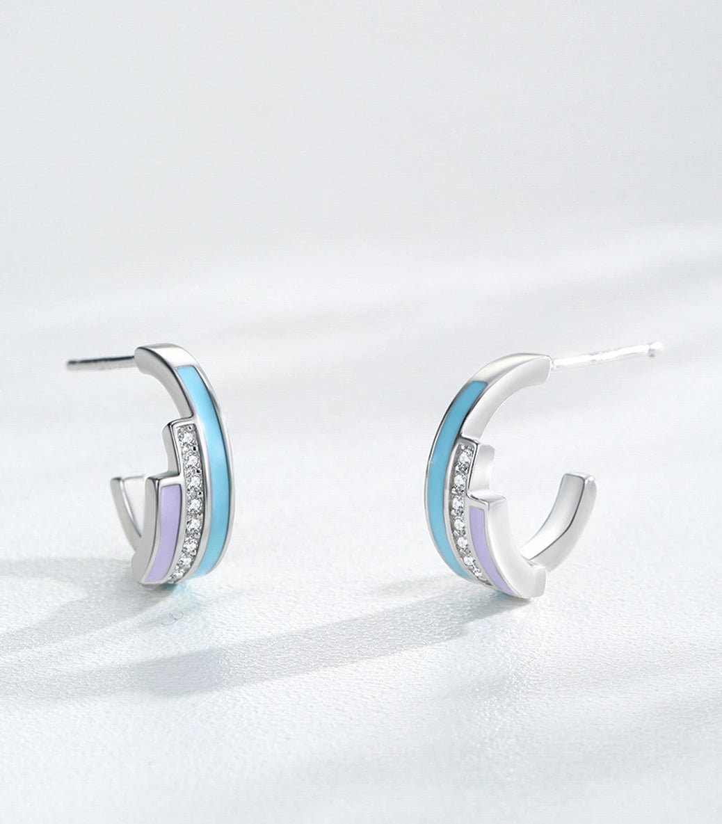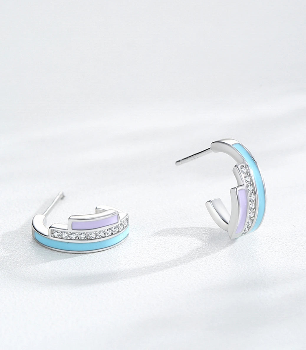 Сребърни обeци с щифт, бял кубичен циркон и разноцветен емайл