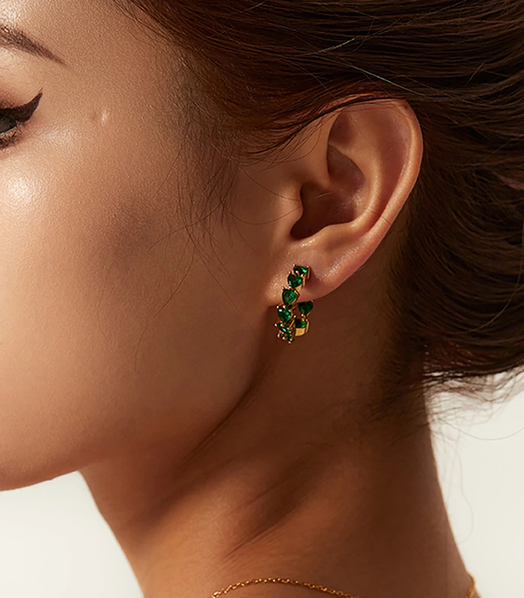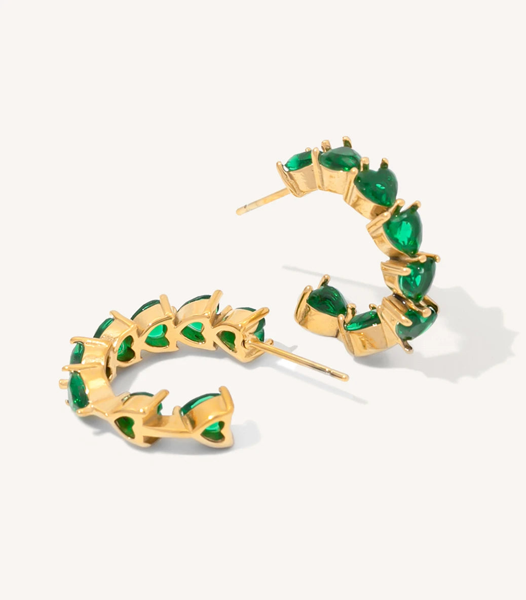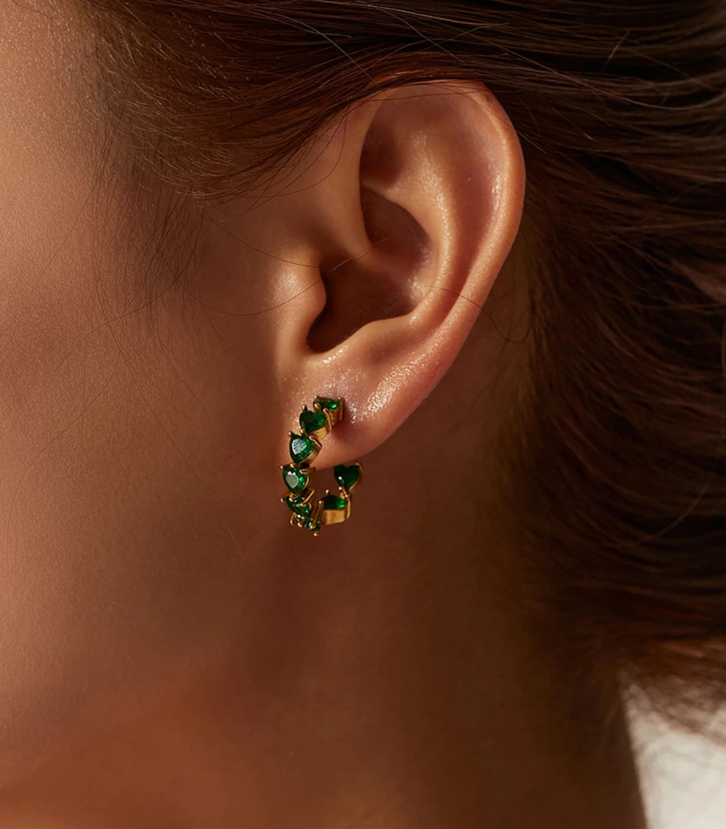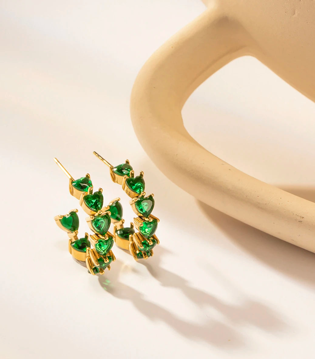Висящи обеци халки сърца със зелен циркон